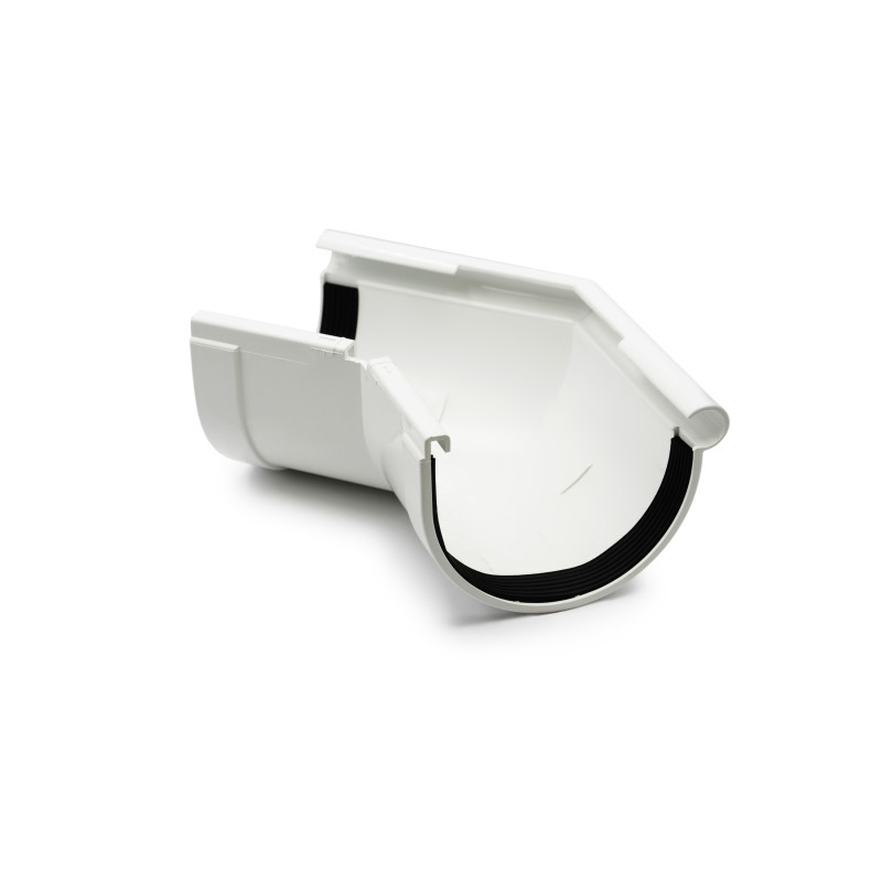 Угол желоба устанавливается по внешним углам крыши и предназначен для соединения желобов в углах здания под углом 135°, что позволяет адаптировать систему к форме крыши.