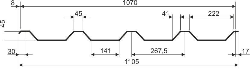 ПРОФНАСТИЛ высотой 45 мм. Характеризуются высокими несущими способностями, высоким качеством металла и долговечностью. Высокая несущая способность достигается за счет разных высот профилей, а также применения конструкционной стали. Именно поэтому несущие профнастилы широко используются в качестве кровли и фасадов.